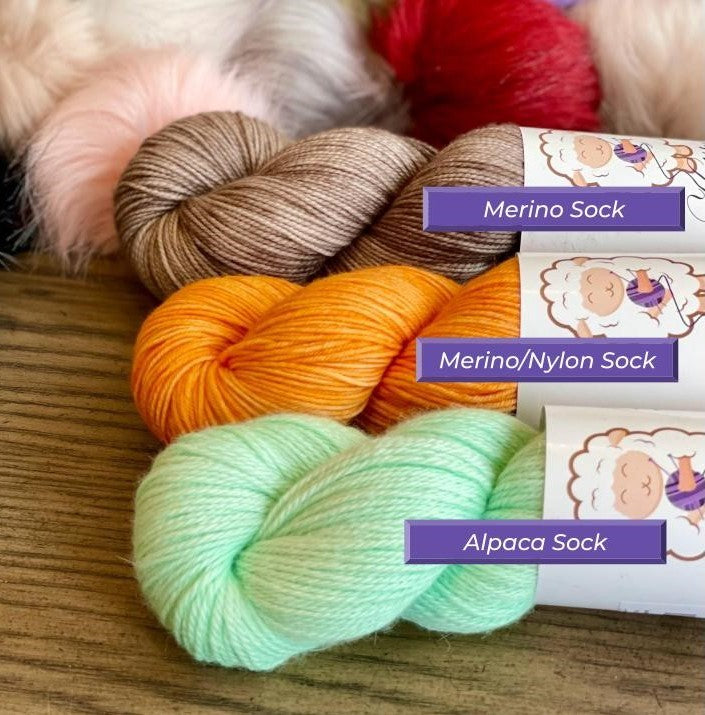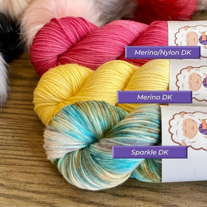 - Merino/Nylon DK - 75% Superwash Merino, 25% Nylon (245yd/100g)