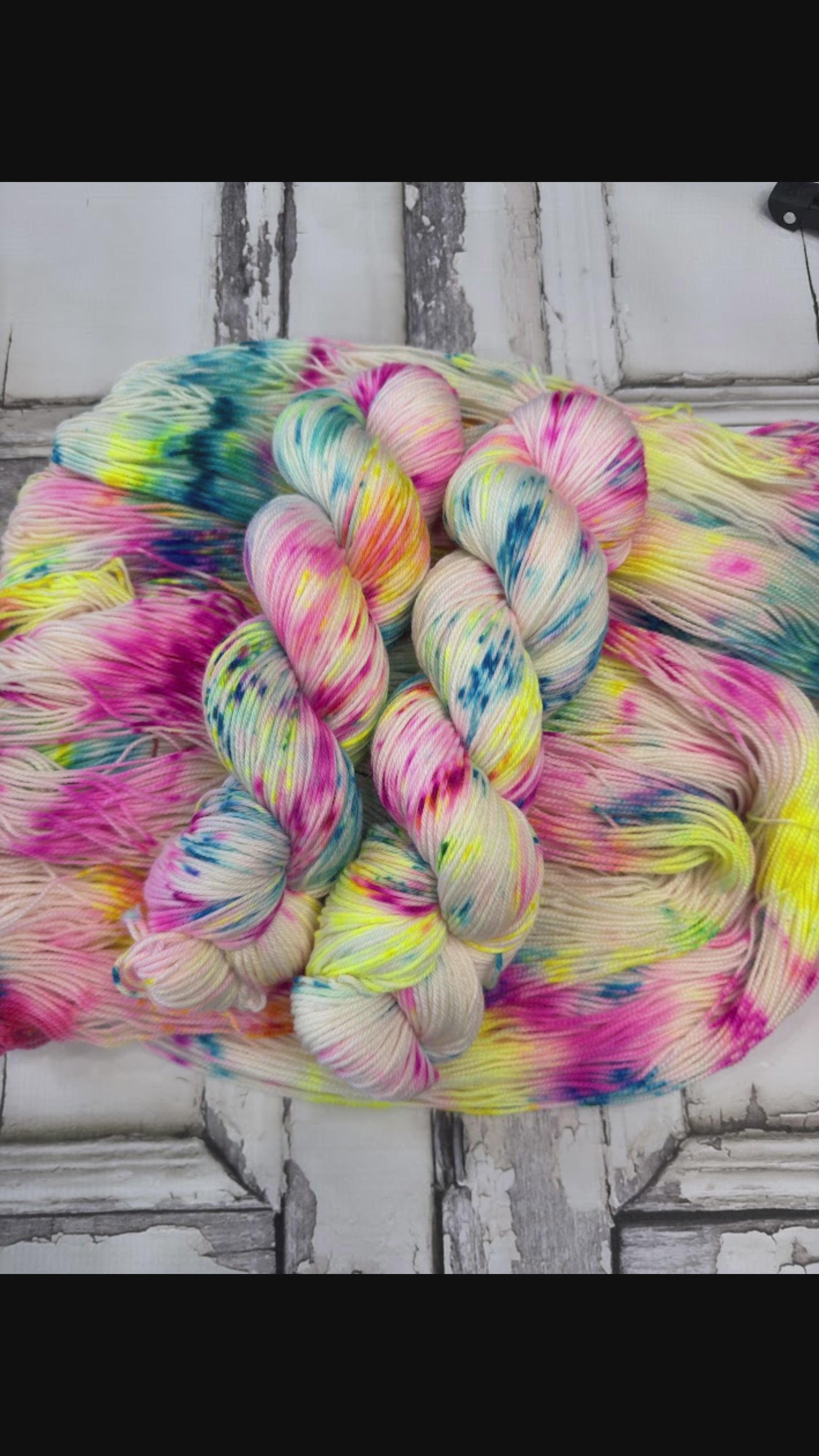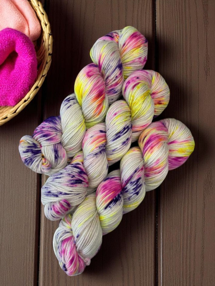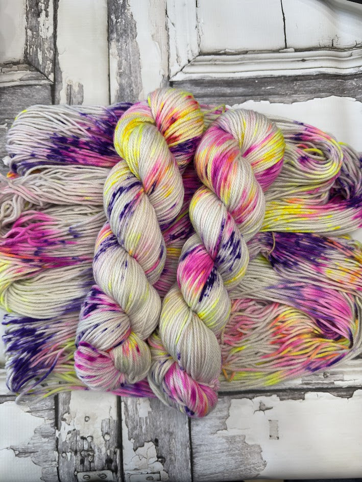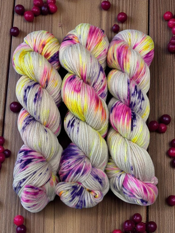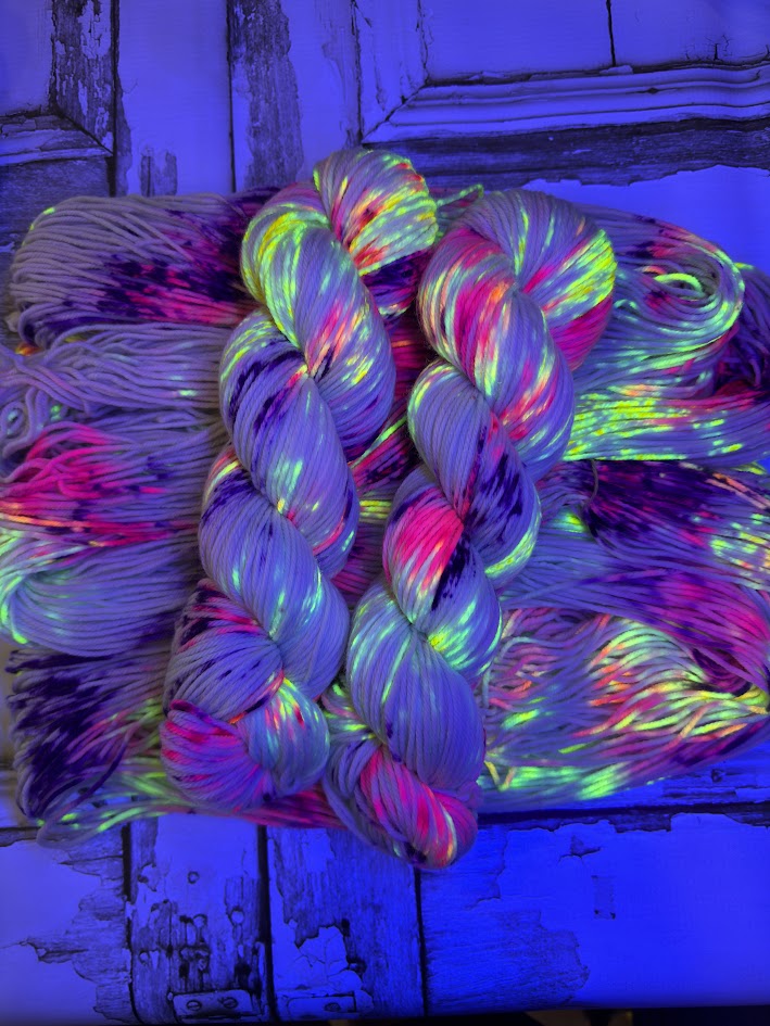 Neon Berries is a fluorescent field of purple, yellow, and pink that is a ton of fun under a blacklight. Enjoy the bright colors on the next project you can't wait to cast on.