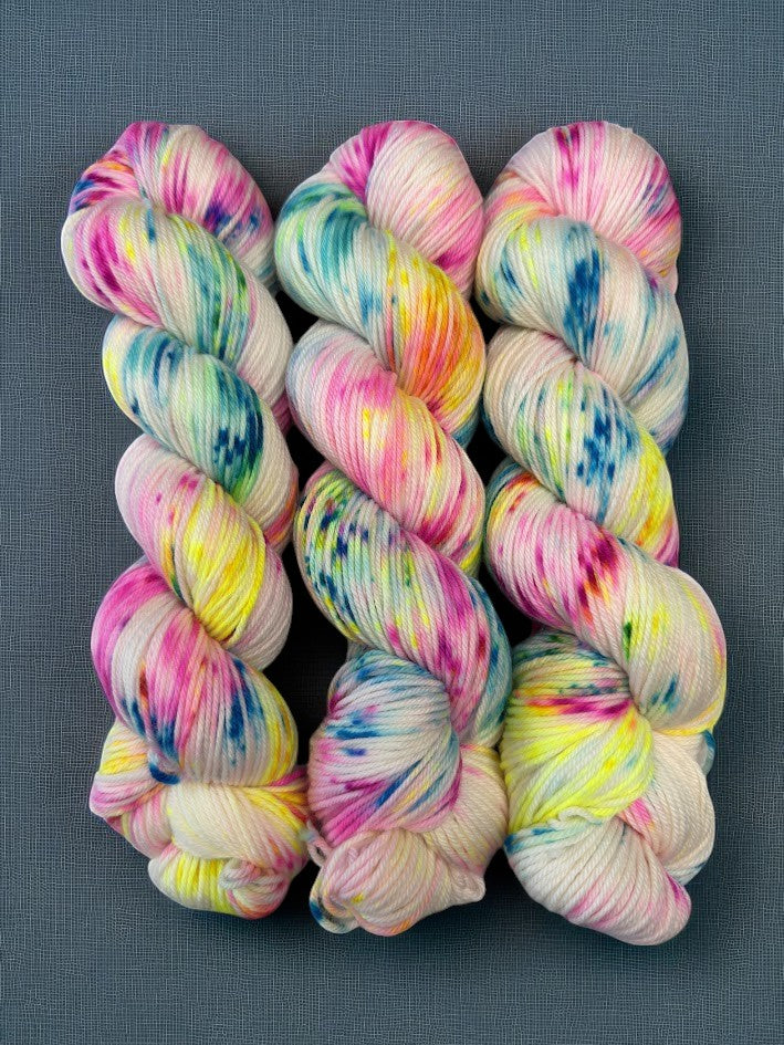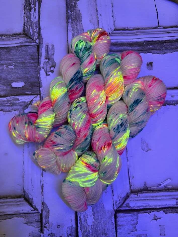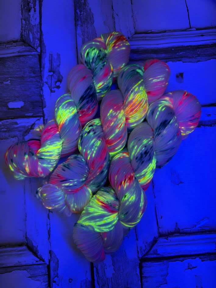 Speckletacular yarn is vibrant, fun, and...well...spectacular! It is part of our fluorescent line that looks amazing both in normal lighting and under a black light. Use it to add a pop of color to any project or use it as your sole color.